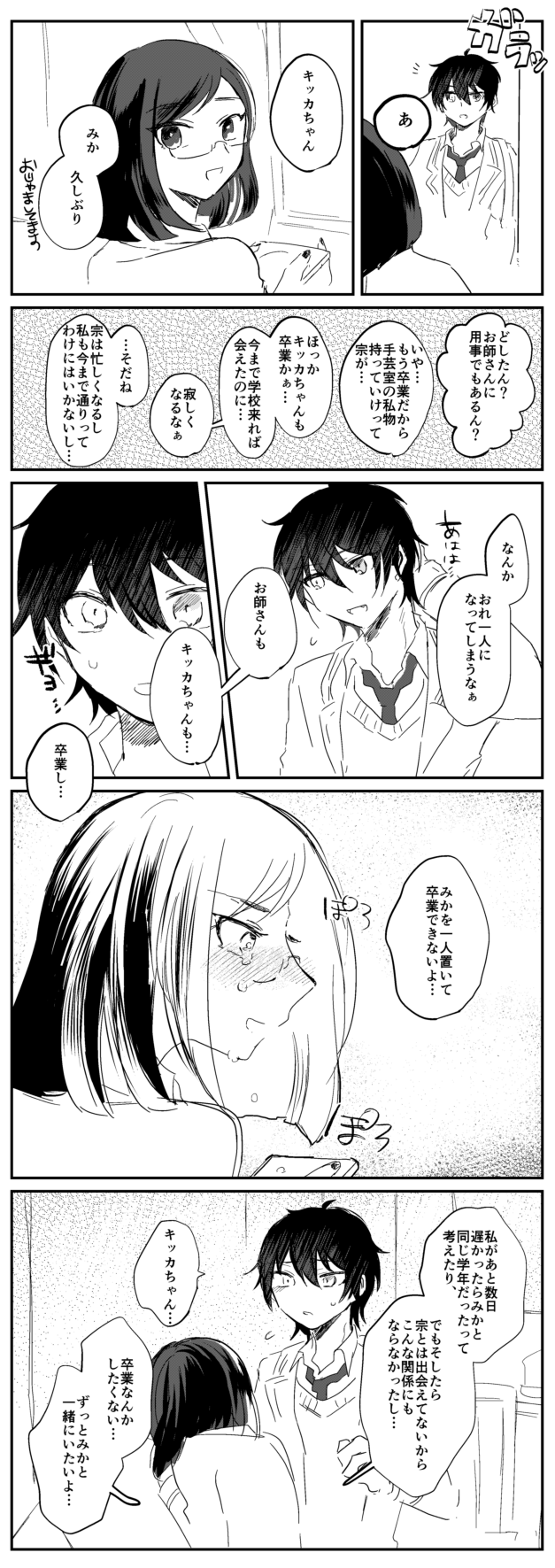 イベント中 Category:未選択 Date:2018年03月02日 イベント前に描いておかねば、解釈違いになって描けなくなるな…と思ったやつ…。 あんスタ絶賛お師イベ中です。初日が休みだったので、爆走決めて今まで出来なかった初日にポイボ★5ゲット出来ました。あとなんだ…?まだ2日目なんですよね…そうとは思えない…ここでイベント終われ…!ってずっと思ってる…。ともやくんももうポイントになってしまう位置まで来てしまって…ダイヤが尽きたら追加してのんびり走ろうと思ってますが………。もう終われ…イベント…!! イベストですが、まださらっとして読めてないのに号泣しまして…。前から口にしているのですが、旧ヴァルと新ヴァルの関係性がすごく好きで…。スタフェスで宗くんの口から「僕の方こそ悪かった」的な言葉で大分救われてこれ以上のものはもう無いのかなと思ってたので、返礼祭はボーナスステージでした。 あと、墓守ストの宗くんのアイドルとしての姿勢がすごく好きなので、今回の「芸術」の話もすごく好みです…。それをみかちゃんが理解している、していないにも関わらず語りかけるのは宗くんの歩み寄りの一つだなと思いますし…今までだったら口にもしなかっただろうなって…。 そしてどんどん畳みかける友情ラッシュ…嵐ちゃん、創くんに泣かされて、てんまくんの明るさに救われて…。みかちゃんが宗くんしか信じられなかったのが、色々な人に触れて一年を過ごし「ヴァルキュリー」を続けようと決意をしてくれて…成長を感じてすごく良かったです! すごく良かったです!としか言ってないのですが、みかちゃん本当に宗くん卒業したら夢ノ咲やめちゃうんじゃないかな!?って思ってたので…笑 いや~良かった。宗くんはハロウィンくらいからなんとなく終わりが見えていたのですがみかちゃんってどうなるんだろうって思ってて…。そしてそれに合わせて、なずなくんも仲直り出来て良かったです。旧ヴァルの関係性が好きな自分としては、みかちゃんの誕生日のなずなくんからの手紙で十分だったのですが…まさかこんなボーナスステージがあるなんて…。あんまり今まであんスタのファンの描写が無かったと思うので考えたこともなかったのですが、そりゃファンは色々邪推するよな~…。地下ライブでファンに注意する宗くん最高じゃん…。 またイベスト読み込んだら色々な感想が出てくると思いますが、とりあえず最高…ありがとうハピエレ…。春からまた冷たいみかちゃん宜しく頼むな!